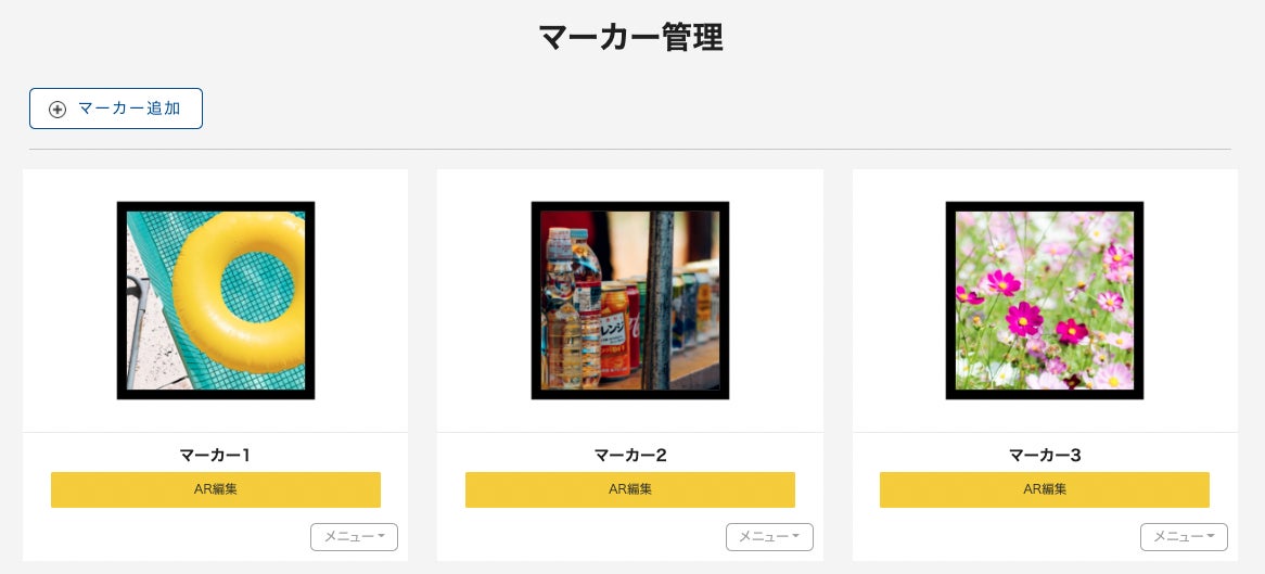 マルチマーカー機能を活用することで、例えば1つのURLで複数のマーカーを認識させるスタンプラリー的な活用や、サンプルのように本やアルバムなど、表示するマーカーによってコンテンツを変えることが可能となります。